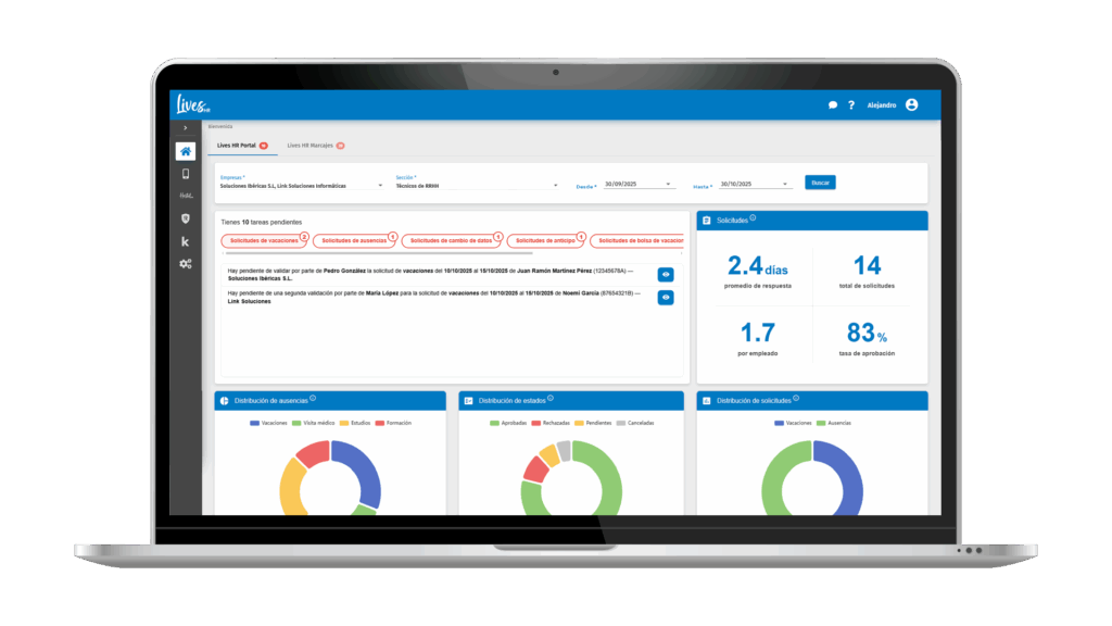 Gestionar personas nunca fue tan fácil Ahorra tiempo, cumple la ley y conecta con tu equipo desde una sola plataforma Registro Horario Portal del Empleado Gestionar personas nunca fue tan fácil Ahorra tiempo, cumple la ley y conecta con tu equipo desde una sola plataforma Registro Horario Portal del Empleado Cumple sin esfuerzo Registro horario legar y automático. Informes listos para inspección. Gestión inmediata Asistencias, ausencias y horas extras en tiempo real. Conecta mejor Avisos, encuestas y documentos en un mismo lugar. Funcionalidades clave Todo lo esencial para RRHH en una sola vista. Sin curvas de aprendizaje. Registro horario Fichajes web/móvil y geolocalización. Portal del Empleado Solicitudes, nóminas y documentos. Vacaciones y ausencias Calendarios compartidos y aprobaciones. Panel de control KPIs claros para decidir mejor. Simplifica tu gestión de RRHH hoy Agenda una demo y descubre cómo ahorrar horas cada semana. Solicita una Demo Solicita una Demo Por qué elegir Lives HR Sencilla desde el primer día. Y siempre con personas detrás. Fácil de usar Interfaz clara e intuitiva. Acompañamiento humano Soporte cercano y rápido. Se integra contigo Conecta con nóminas, ERP y BI. Escalable De 10 a 1.000 empleados sin complicaciones.