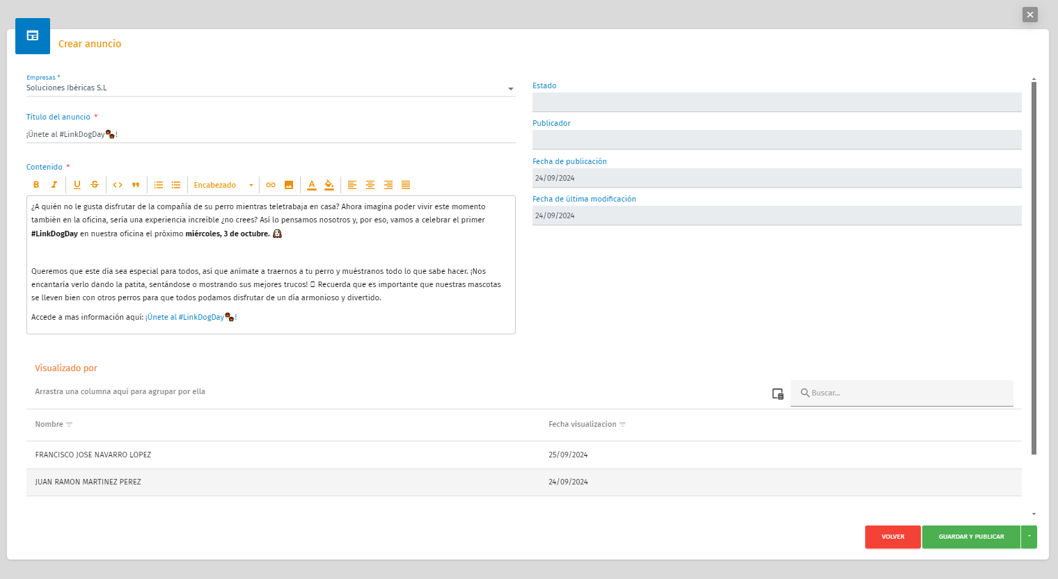 Crea y publica anuncios en un tablón virtual visible desde la APP. Monitoriza quién ha leído los anuncios, asegurando que todos estén al tanto de las novedades y comunicados importantes.